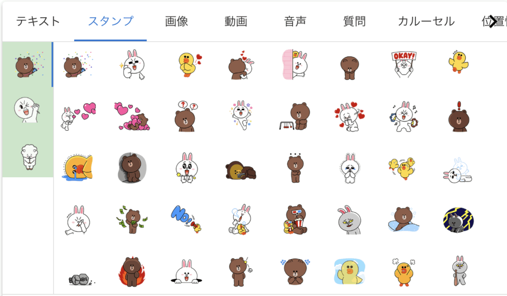 スタンプを使う場合は「スタンプ」を選択し、一覧の中からスタンプカテゴリをクリックします。