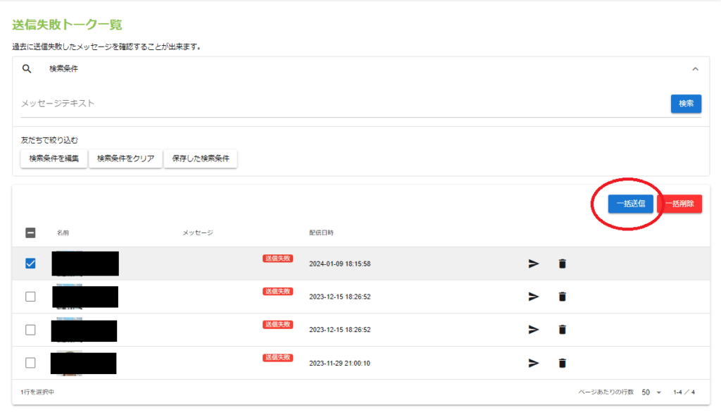 STEP3:「一括送信」ボタンをクリックすると、選択したメッセージが再送されます。