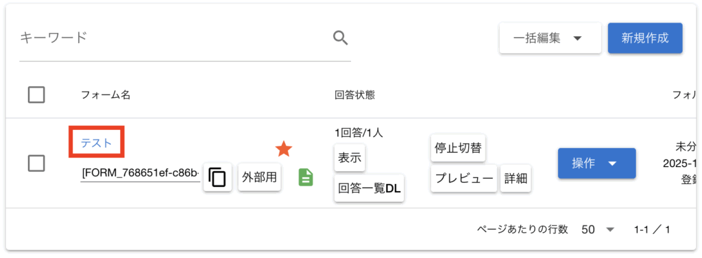 作成済みの回答フォーム一覧が表示されるので、アクションを設定したいフォームの名前をクリックします。