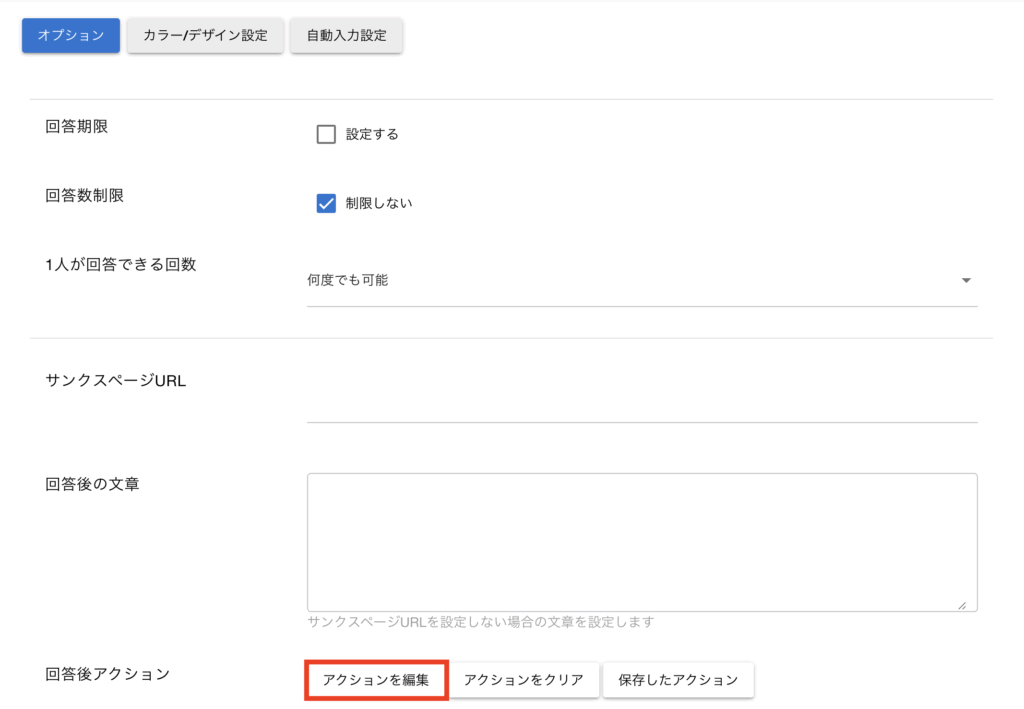 この「アクション設定」を使うことで、回答結果に応じて自動的に次の処理を行えます。