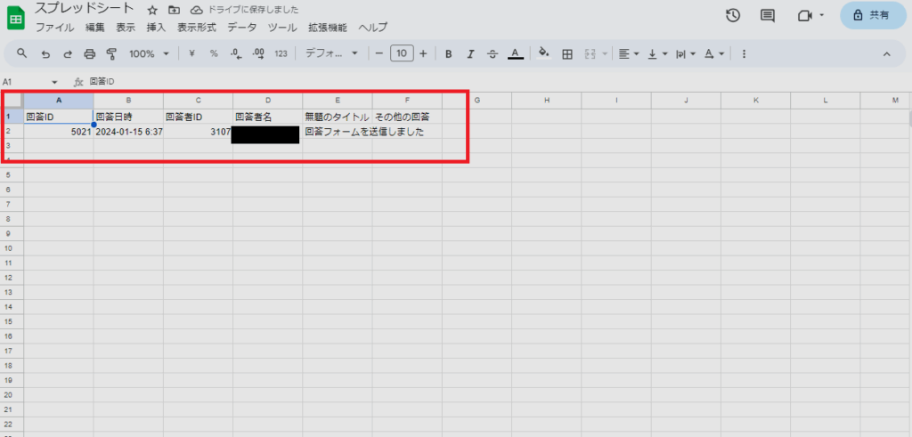 スプレッドシートは自動生成され、フォームの回答が新たに届くたびに行として追加されます。