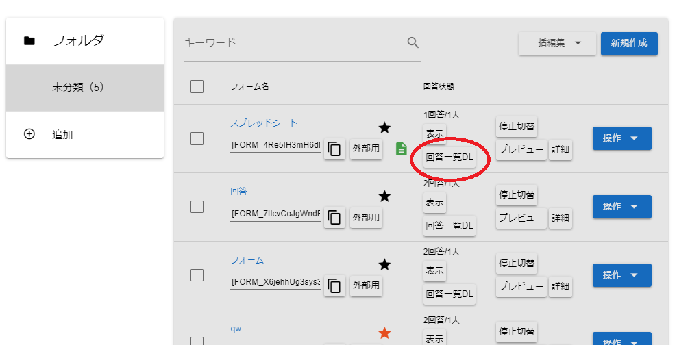 - 回答フォーム一覧にある「スプレッドシートのマーク」をクリックして開く