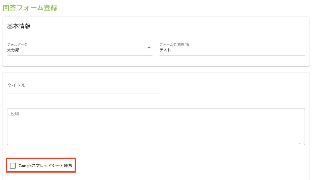 フォーム作成画面の下部にある「Googleスプレッドシート連携」にチェックを入れます。