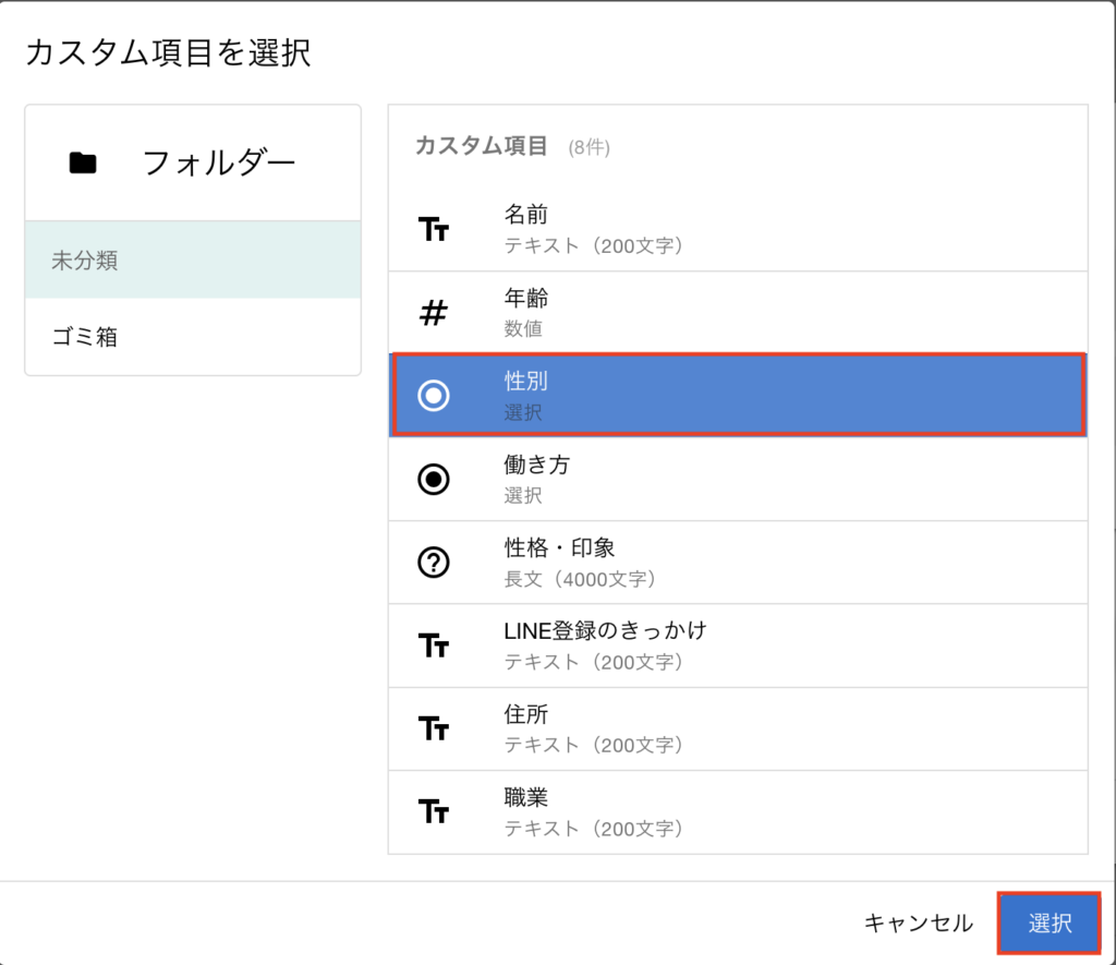 回答を反映させたいカスタム項目を選択し、「選択」をクリックする。