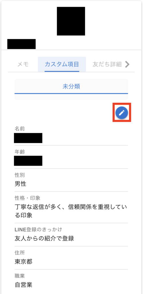 個別トークの友だち情報欄では、友だちごとの基本情報や、カスタム項目・タグ・メモなど