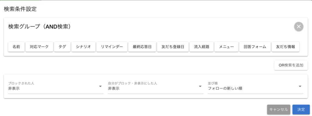 友だちリスト画面では、条件を指定して友だちを検索・絞り込みすることができます。