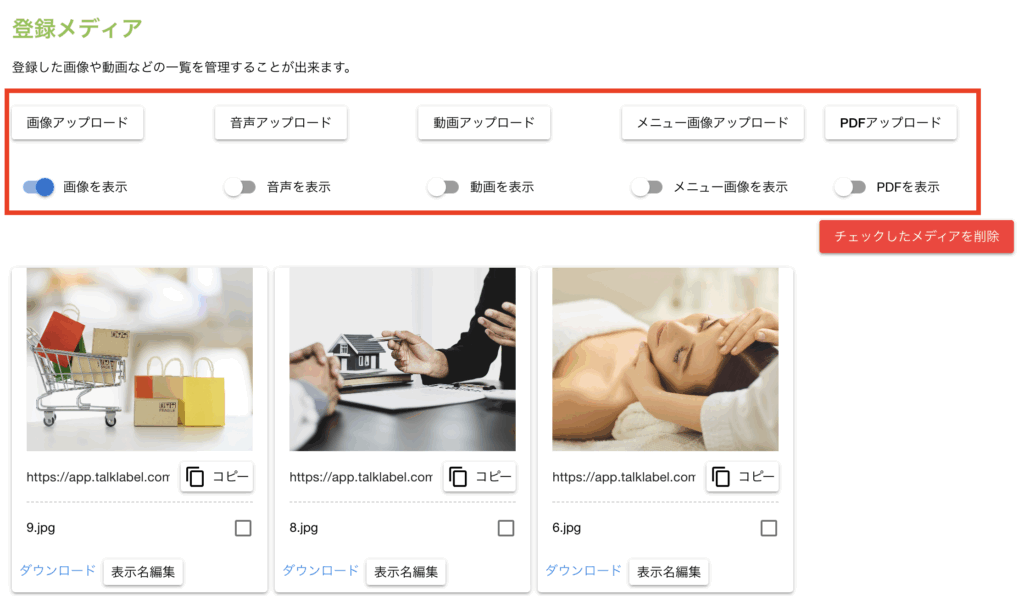 【登録メディア】ページでは、TalkLabel上でアップロードした画像・音声・動画・ファイルなどの