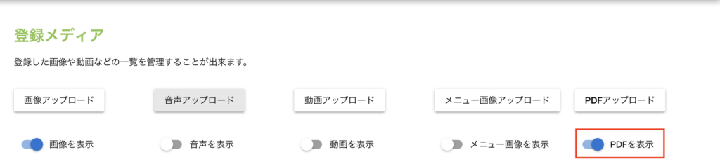 アップロードボタンの下にあるON/OFFの切り替えで、一覧に表示されるメディアの種類を変更することが可能です。