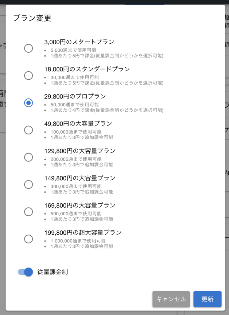 スタートプラン~プロプラン間は、使用可能機能が異なるためダウングレードできませんので、アップグレードの際はご注意ください。