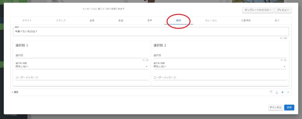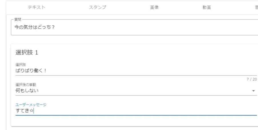 TalkLabelでは、質問を送信し、ユーザーに選択肢の中から回答を選んでもらう形式のメッセージを作成できます。