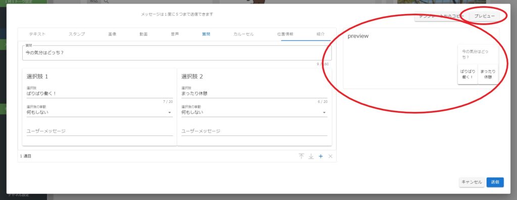 選択肢の数が2つまでの場合は【質問】機能が適しており、3つ以上の場合は【カルーセル】機能の利用がおすすめです!