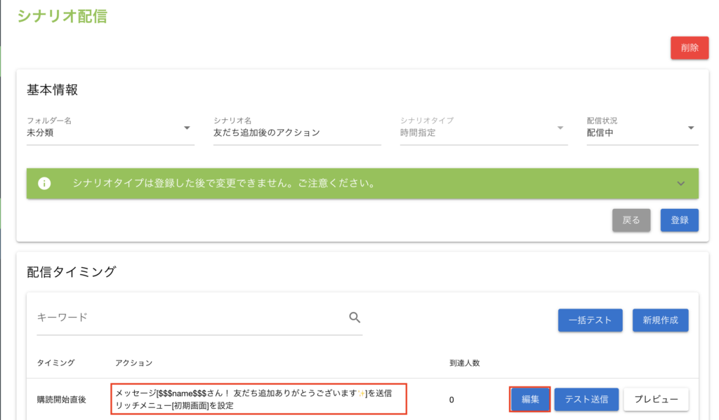 左側メニューから【シナリオ配信】をクリックし、