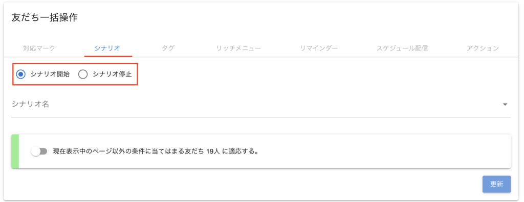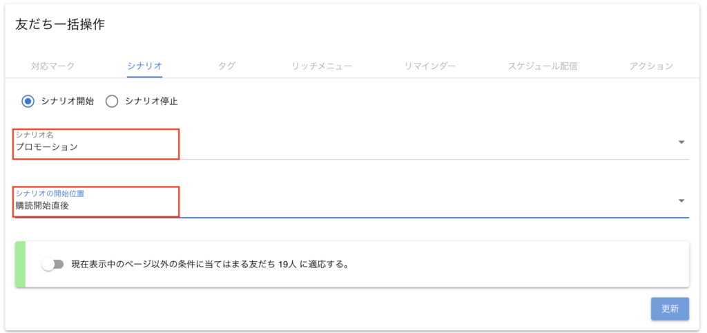 配信したいシナリオ名と開始位置を選択し、【更新】ボタンをクリックします。