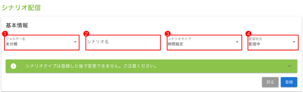 | (3) シナリオタイプ※ | シナリオの配信方式を選択します。「時間指定」と「経過時間指定」の2種類があります。 シナリオタイプは登録後に変更できないため、作成時に注意が必要です。 |