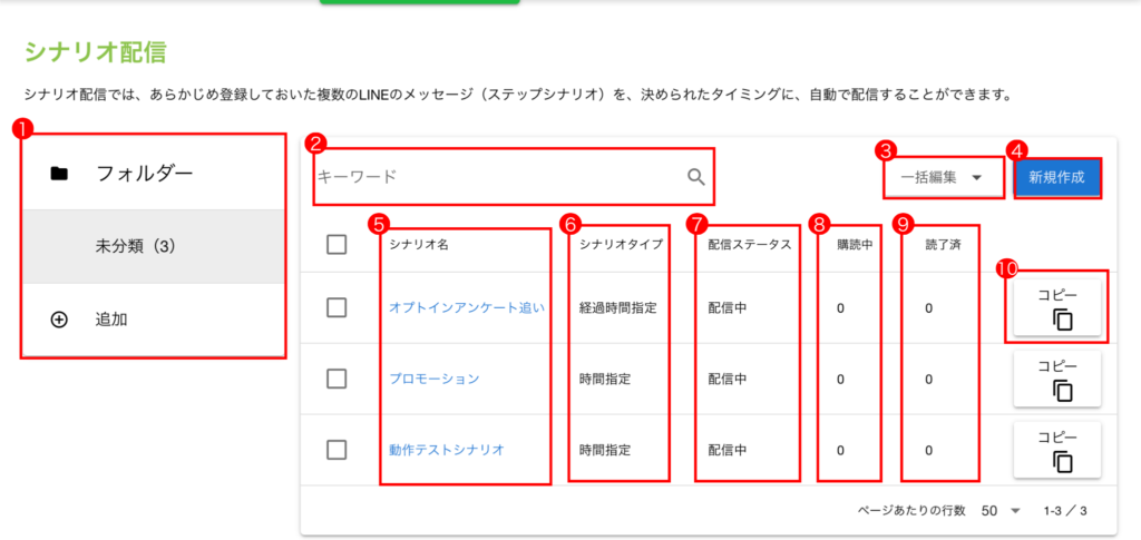 | (7) 配信ステータス | シナリオが現在配信中か停止中かを示します。運用中のシナリオかどうかを一目で確認できます。 |
