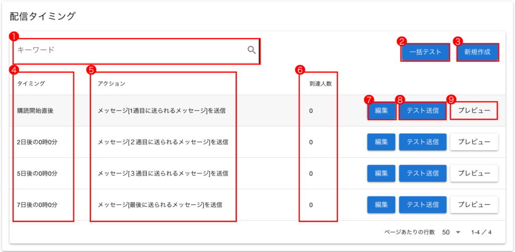 | (4) タイミング | メッセージが送信される配信タイミングを表示します。「購読開始直後」や「◯日後の◯時◯分」など、配信条件の基準となる情報を確認できます。 |
