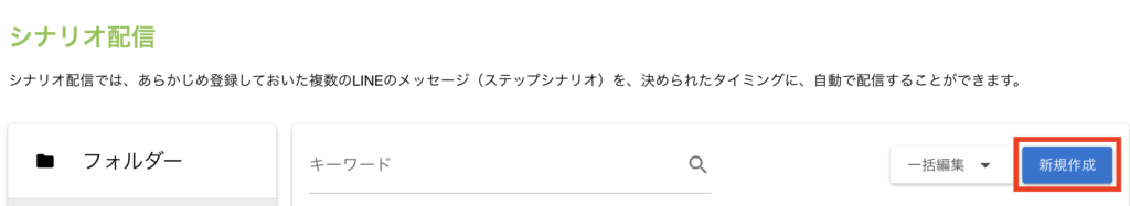 左側メニューの【シナリオ配信】をクリックし、画面右上の【新規作成】ボタンをクリックします。