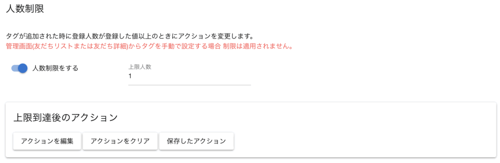 上限人数・上限到達後のアクションを設定し、登録ボタンをクリックしたら設定完了です。