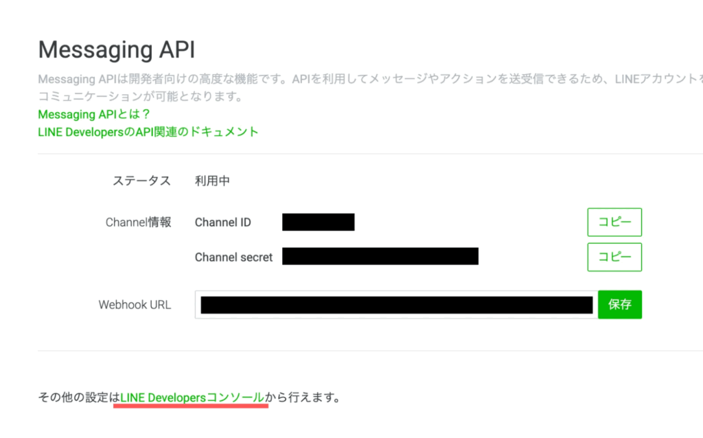 ①LINE公式アカウントのMessaging APIの画面(以下画像)の [LINE Developersコンソール]をクリックします。