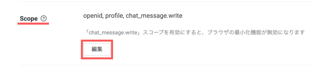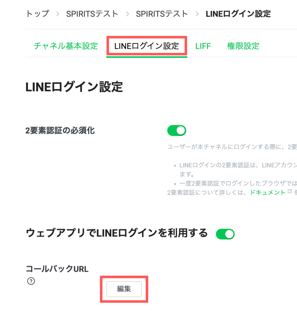 ②LINE Developers の画面に戻り、LINEログイン設定からコールバックURLの横の[編集]ボタンをクリックします。
