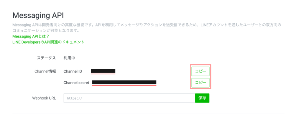 Messaging API初期設定の初期設定が完了したら「Channel ID」と「Channel Secret」が表示されます。