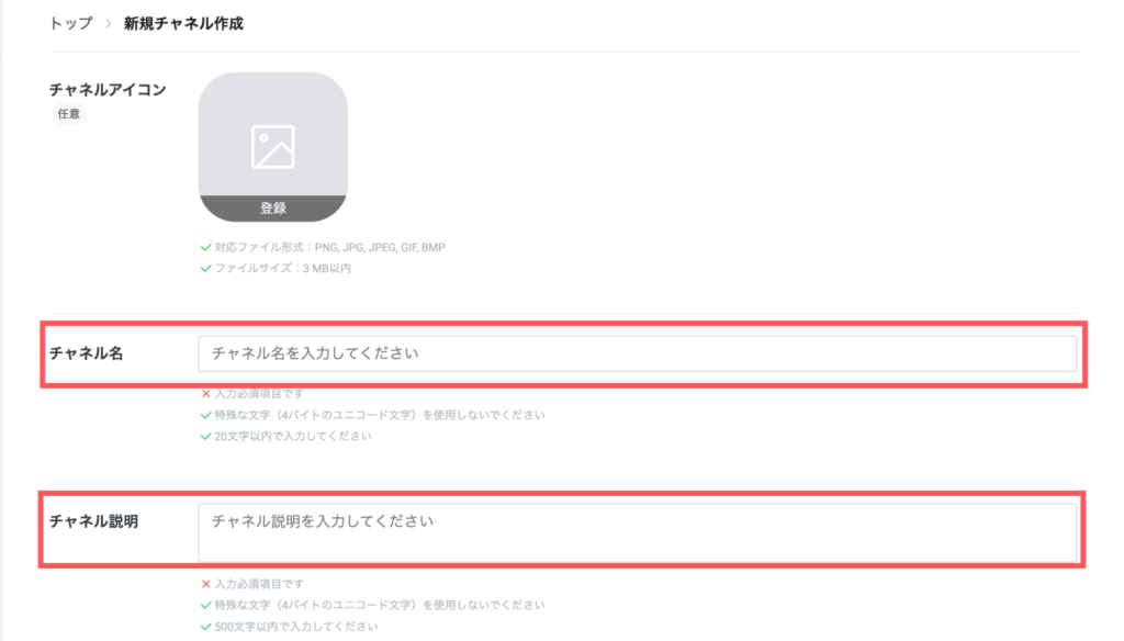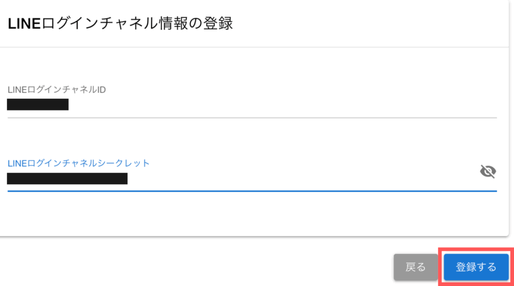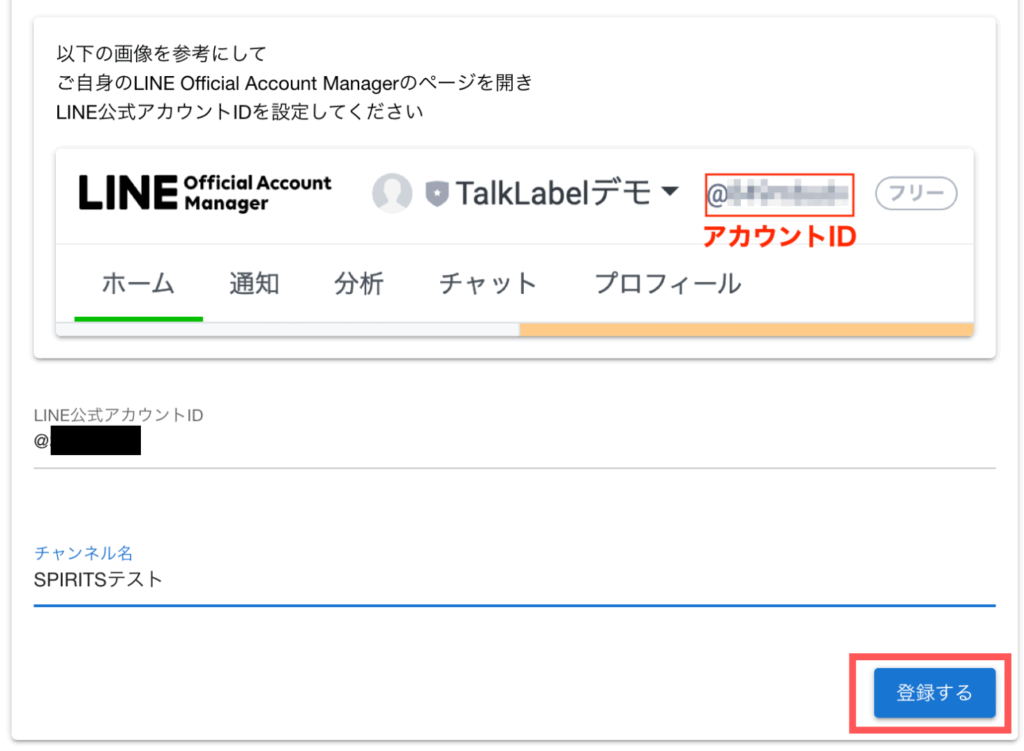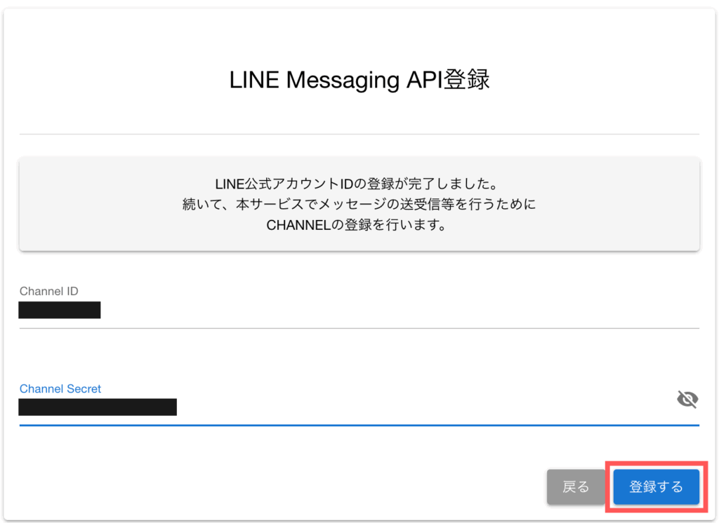 LINE公式アカウントID、チャンネル名が入力できたら[登録する]ボタンをクリックしてください。