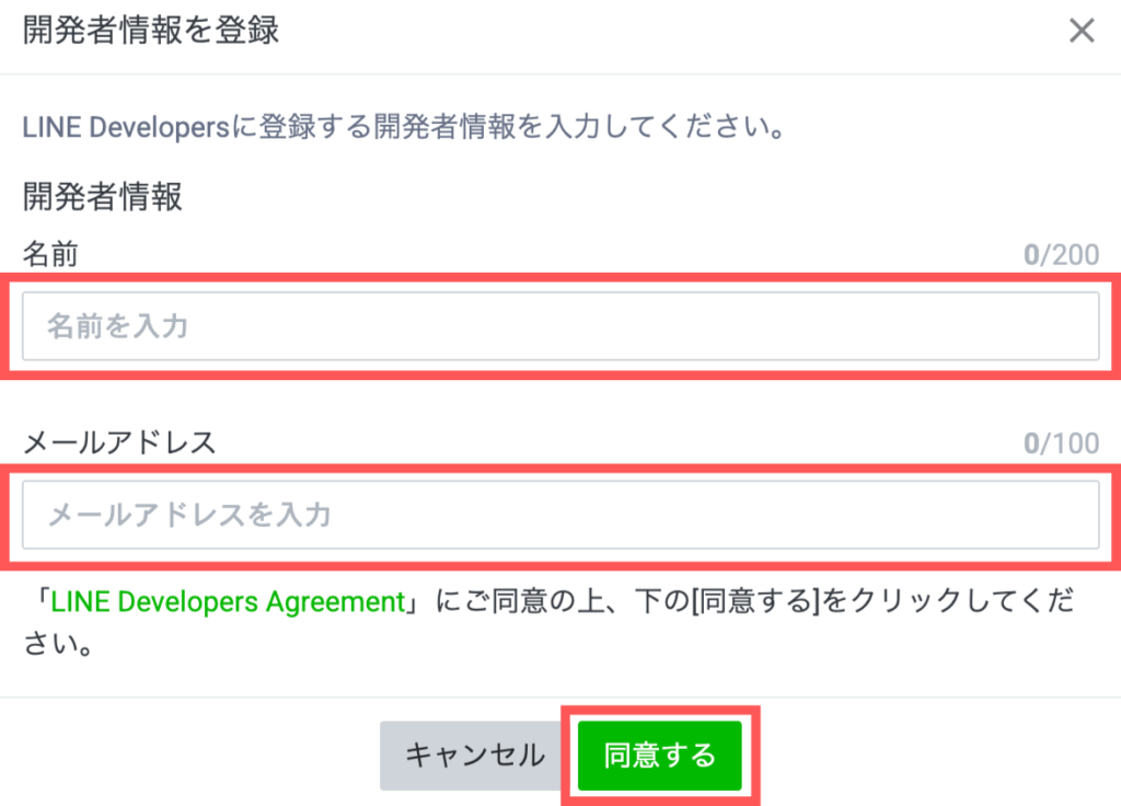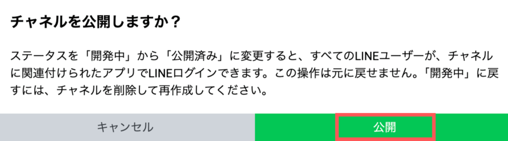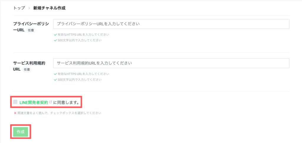 ⑦記入が完了したら「LINE開発者契約」を確認してチェックを入れて[作成]ボタンをクリックしてください。再度確認が表示されるので[公開]をクリックしてください。