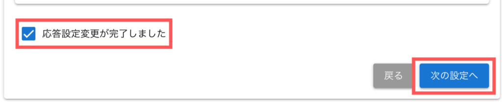 「応答設定変更が完了しました」にチェックを入れて[次の設定へ]をクリックしてください。