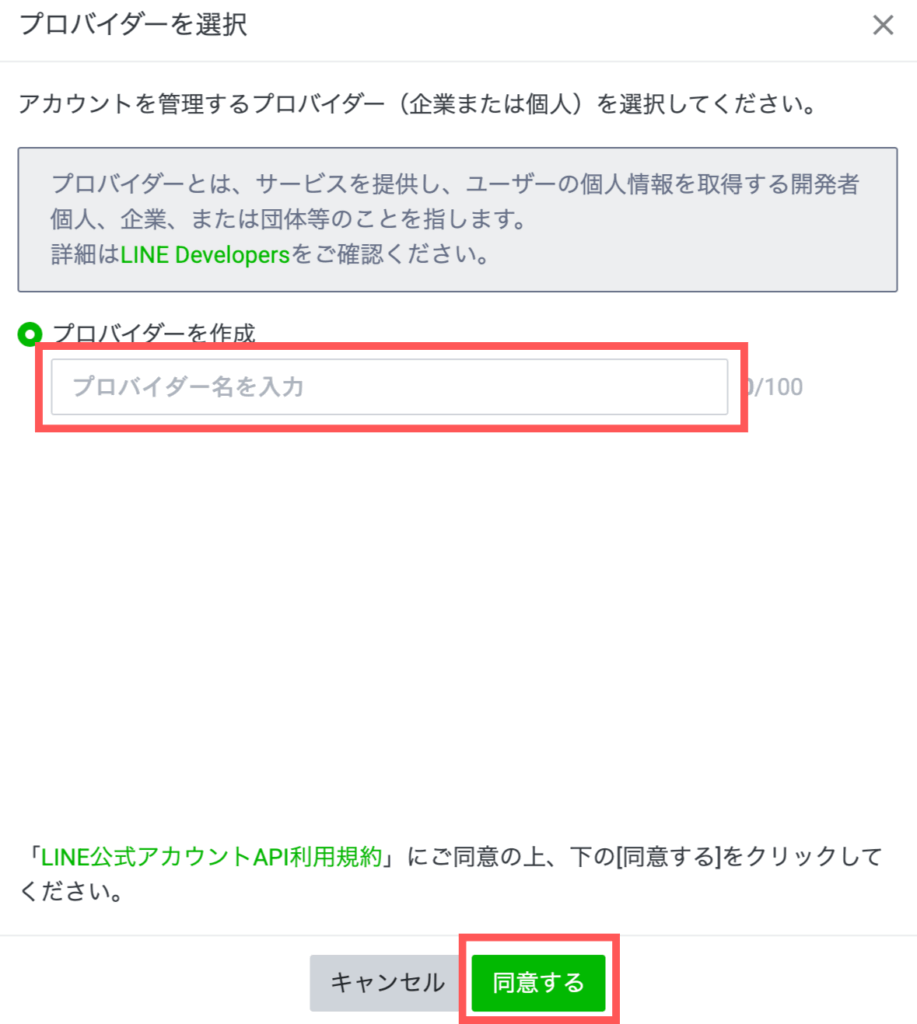 「LINE公式アカウントAPI利用規約」をご確認の上[同意する]をクリックしてください。