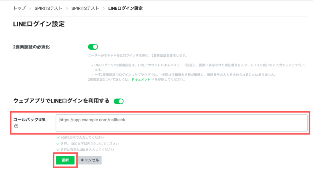 ③テキストボックスが表示されるのでここにコールバックURLを入力して[更新]をクリックしてください。