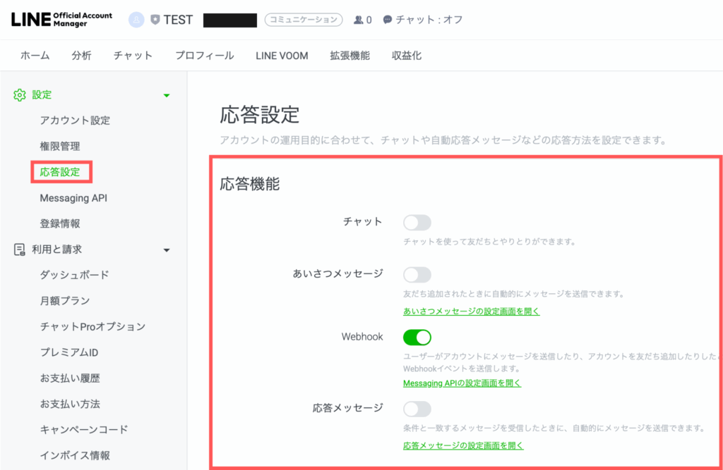 LINE公式アカウントの画面を開き左側のメニューから[応答設定]をクリックしてください。