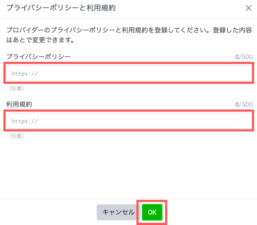 現状利用しているプライバシーポリシーと利用規約があればURLを入力して[OK]をクリックしてください。