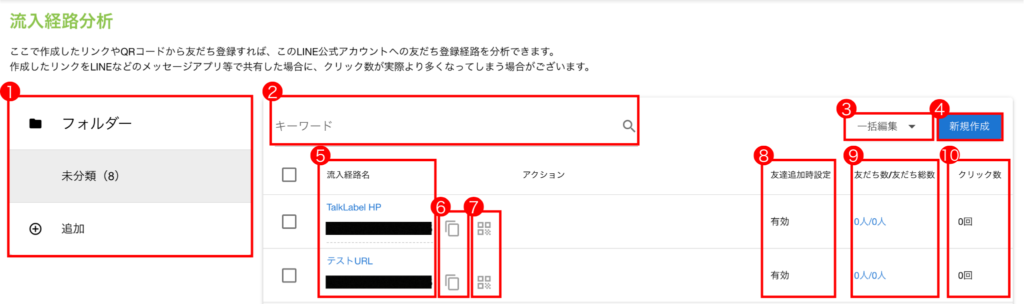 | 1.フォルダーエリア | 流入経路リンクを分類管理する場所。媒体別・キャンペーン別に整理すると運用しやすくなります。 |